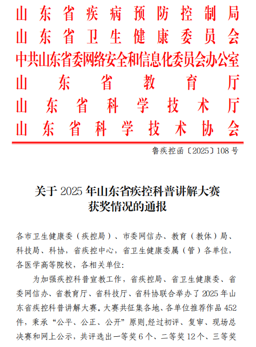 本次大赛由山东省疾控局、省卫生健康委等六部门联合主办,全省16地市及省直属单位广泛参与。大赛共征集452件作品,经过初评、复审等环节的严格筛选,最终18件作品晋级总决赛。