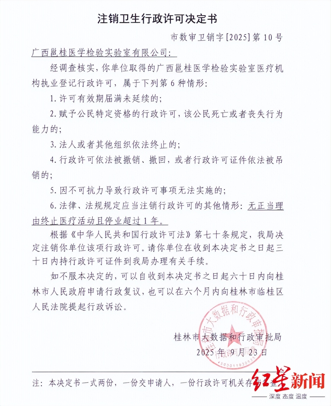 黄女士告诉记者,项目停滞后邕桂公司仍需每月缴纳场地租金、发放工资、维护设备等,每月支出约30万元。2025年11月,邕桂公司被物业方诉至法院并进入强制执行程序,其3套医疗器械已被拍卖偿债。同时因未开业,桂林市大数据和行政审批局于2025年9月对其发出注销卫生行政许可决定书。