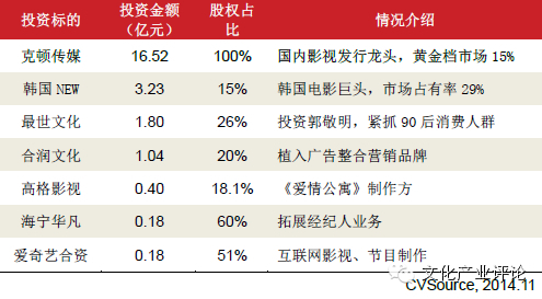 互联网及其它资本的进入将使影视行业形成更高效链条,各个环节协同发力,未来会有更多的创新模式,共同做大文化传媒产业蛋糕。互联网龙头企业也开始进入到文虎传媒领域中来,根据投中集团旗下金融数据产品CVSource统计,截止2014年10月,互联网龙头企业阿里巴巴共发起56起并购,已完成36起,其中文化传媒产业13起,已完成8起,进行中4起,失败1起。