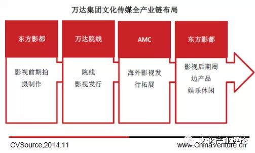 随后,万达集团于2012年9月5日宣布以26亿美元的价格收购全球第二大院线AMC公司,开始涉足海外电影市场;2013年万达集团又投资500亿元人民币在青岛成立东方影都,打造成为兼具影视外景、影视制作、影视会展、影视旅游等综合功能的项目。万达集团已经打造出集拍摄、内容、院线、后期加周边的全产业链模式。