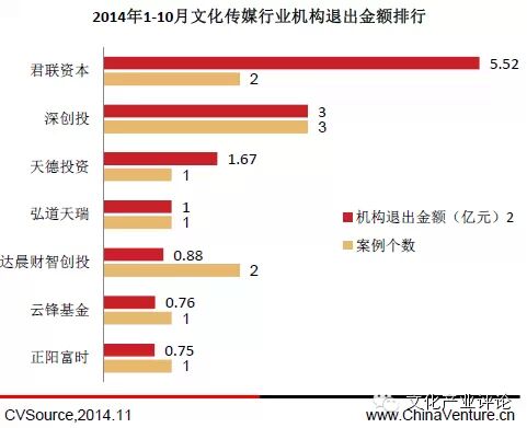 从退出机构来看,君联资本在2014年前10月文化传媒行业并购中有退出案例2起,退出公司分别为耀莱影城及天神互动,总计退出账面回报5.52亿元,列第一位;而深创投总计退出3起案例,分别为蓝色火焰及乐视新媒体,总计账面回报3亿元的成绩位列第二。