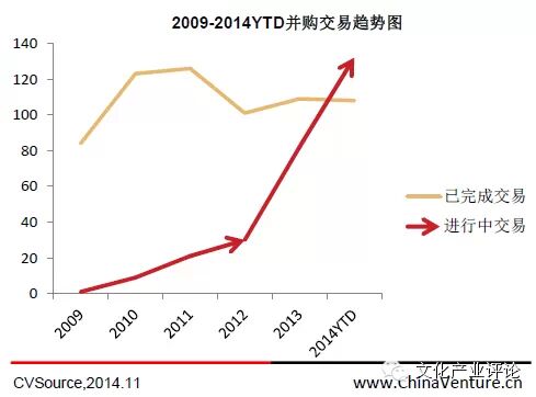 根据投中集团旗下金融数据产品CVSource统计,截止2014年10月,文化传媒行业已完成并购数量达到651起,涉及电影、电视剧、出版、广告、游戏等子行业,累计金额千亿元。另外,仍有279起交易正在进行中,其中于2014年未完成交易有132起,2013年未完成交易为82起,有望为市场带来超千亿规模。