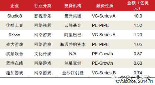 表6:2014年1-10月文化传媒行业融资案例