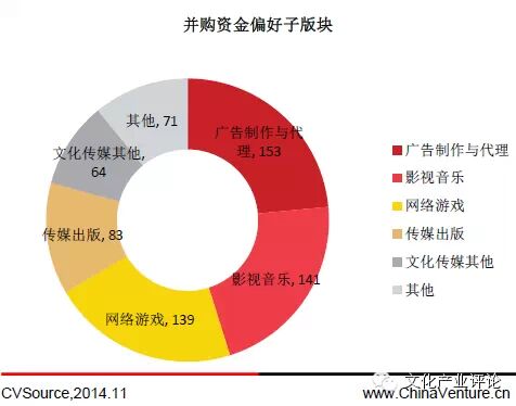 值得注意的是,文化传媒产业的收购行为并不局限于本行业的公司,而通过并购方式延伸产业链,也是目前许多公司进入文化传媒产业的主要方式。场外资本看好传媒娱乐业的未来发展,而根据投中集团旗下金融数据产品CVSource统计,游戏、影视是当前资本并购的主要方向。