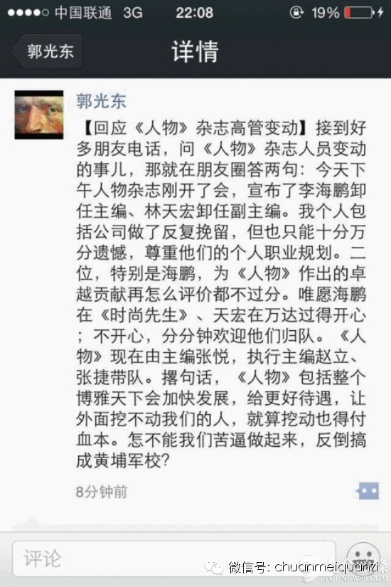 4月17日晚,《人物》杂志出版人、博雅天下传播机构副总裁郭光东,通过新浪微博和微信圈,正式回应了《人物》杂志高管离职一事,他确认李海鹏、林天宏在昨天下午正式卸任主编、副主编一职,分别加盟《时尚先生》和万达。林天宏任职于万达的内刊系统推测。