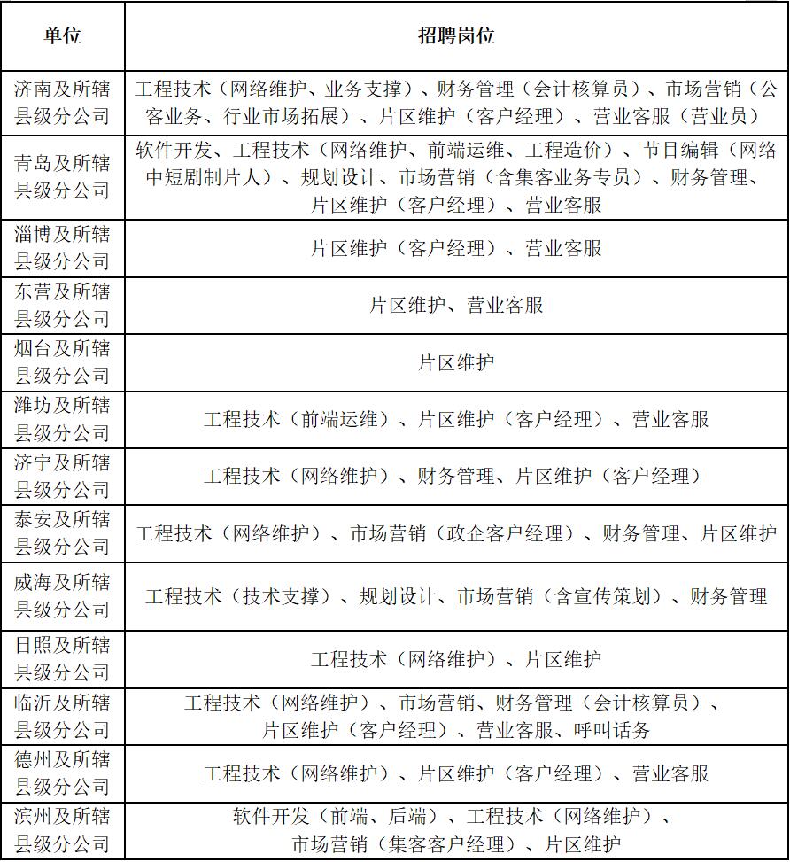 中国广电山东网络有限公司(原山东广电网络有限公司,成立于2001年,2021年6月更名)是中央大型文化企业中国广电网络股份有限公司的控股子公司,主要负责山东省内广播电视网络和智慧广电业务的规划、建设、运营和管理,广播电视节目制作、编辑、采集、经营及广播电视节目传送业务等,拥有32万公里有线电视传输干线和5G 700M、4.9GHz 频谱、192号码段等资源,作为新型广电媒体传播网、国家文化专网、国家新型基础设施网和重要战略资源网,是舆论宣传主渠道主阵地和综合文化信息服务商。目前,公司下辖16家市级公司,138家县(市、区)公司和19家控股子公司。公司用户总量和经营总量位居全国前列,已建成覆盖省市县乡村五级的有线传输网络和统一智能的技术平台,拥有直到村一级的服务体系。公司两次荣膺全国“文化企业30 强”,荣获“全国文化体制改革先进单位”、山东省“省级文明单位”“重合同守信用企业”等荣誉称号。为适应事业发展需要,进一步优化公司人才队伍结构,本着“公开、平等、竞争、择优”的原则,招聘市、县公司工作人员,具体事宜如下: