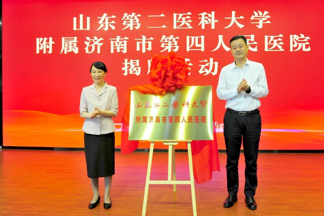 在济南市第四人民医院,管英俊与孙郡共同为“山东第二医科大学附属济南市第四人民医院”揭牌。