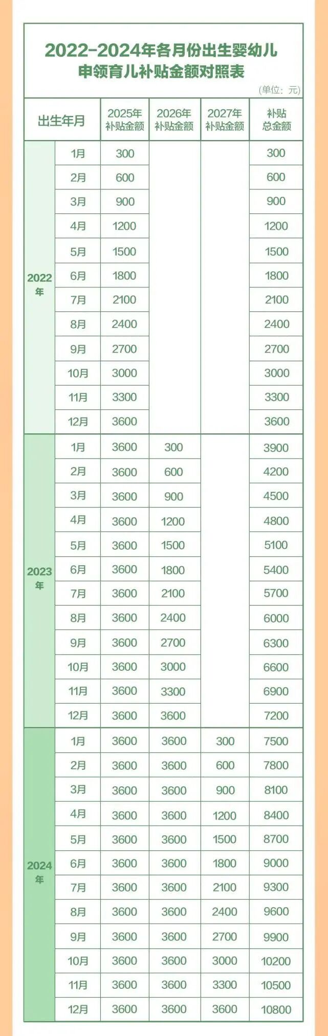 (1)对于2025年1月1日及以后出生的婴幼儿,可连续申领3年补贴,共计10800元。