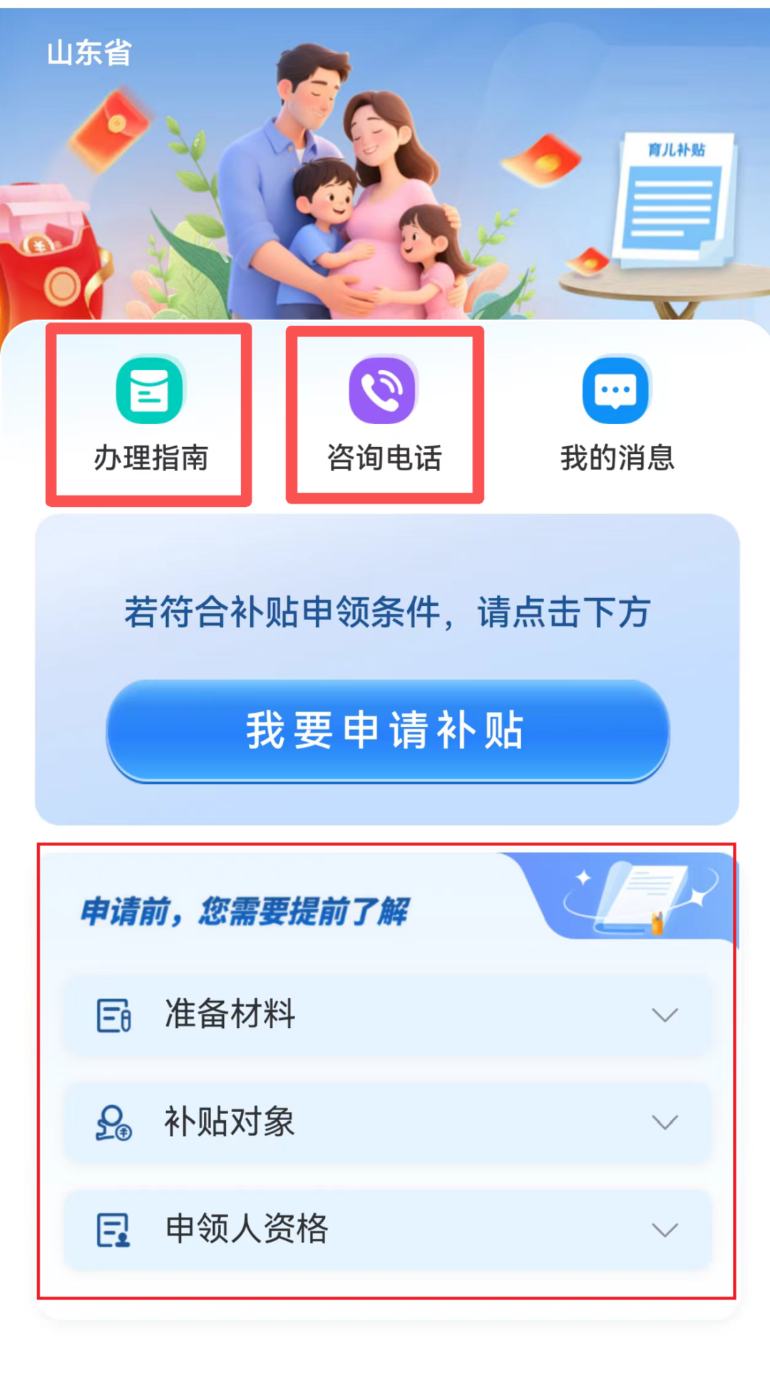 温馨提示:如果在申领过程中对申领程序、申领所需材料等有疑问,可在支付宝、微信平台“育儿补贴”小程序、爱山东App的育儿补贴申领专区查阅“办理指南”板块,按照流程申领。也可在“咨询电话”板块查找电话进行咨询。在“准备材料”板块查询需要提交的申领材料。