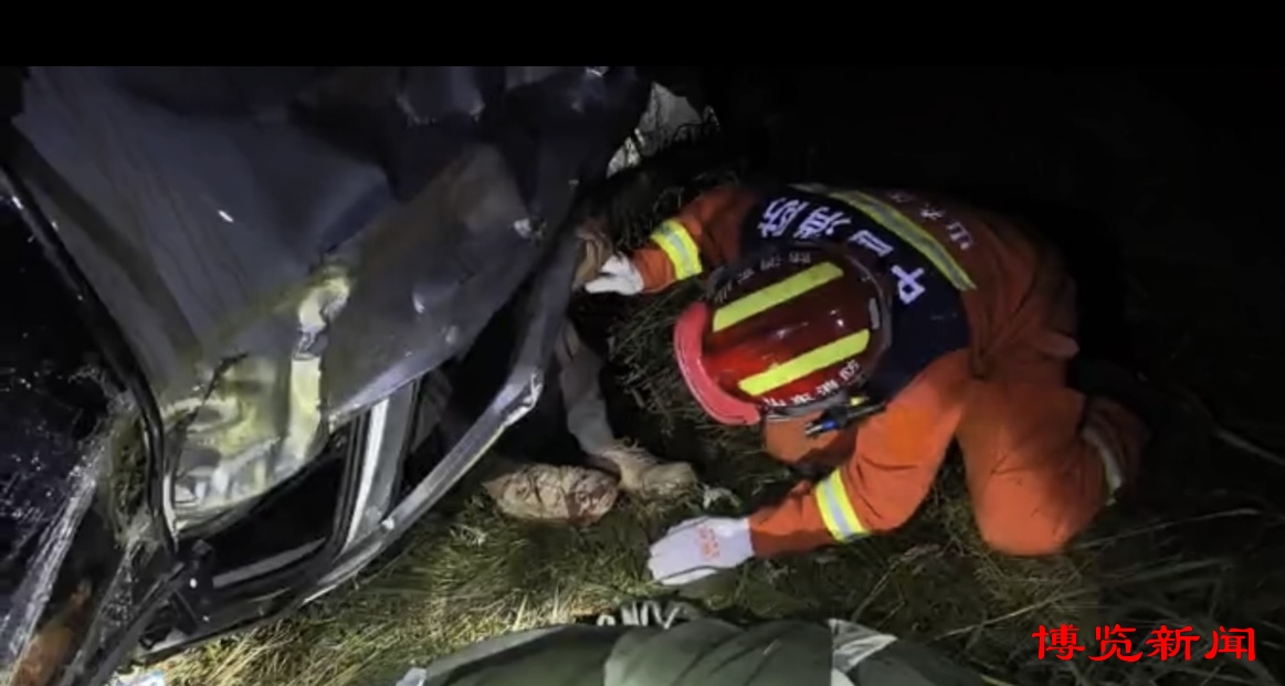 现场情况远超预期:面包车冲破护栏,沿陡坡滚落约50米,最终卡在山沟底部的树丛中。山间漆黑一片,强光手电的光束被植被与沟壑阻断,无法直达被困车辆。消防员随即兵分两路,一组在路面设置警戒,防止二次事故发生;另一组携带绳索向沟底试探行进,同时向已自行爬回路面的 2名被困人员了解车内情况。“车上共6人,还有4人困在车里,不清楚他们是否受伤。” 脱险人员的话让现场气氛更显紧张。