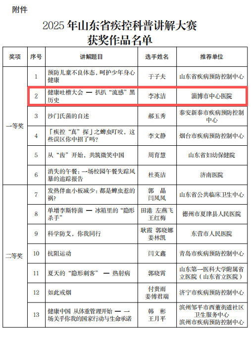 近日,2025年山东省疾控科普讲解大赛总决赛在济南落下帷幕。淄博市中心医院呼吸与危重症医学科主管护师李冰洁凭借作品《健康吐槽大会——扒扒“流感”黑历史》,从众多参赛作品中脱颖而出,荣获一等奖,为医院争得荣誉。