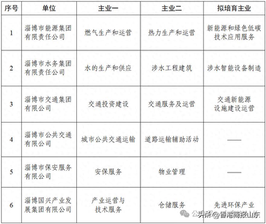 11月03日,淄博市国资委公布了淄博市能源集团有限责任公司、淄博市水务集团有限责任公司、淄博市交通集团有限公司、淄博市公共交通有限公司、淄博市保安服务有限公司、淄博国兴产业发展集团有限公司这六户市属国企的主业核定情况以及拟培育的主业。