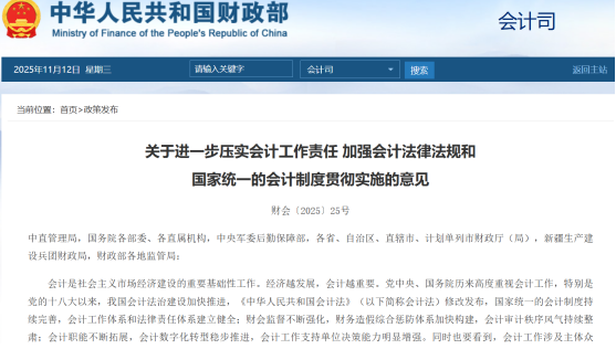 据财政部网站,近日,财政部印发了《关于进一步压实会计工作责任加强会计法律法规和国家统一的会计制度贯彻实施的意见》(财会〔2025〕25号,以下简称《意见》),将目前会计法律法规、国家统一的会计制度关于会计工作责任的规定,梳理形成会计责任清单。