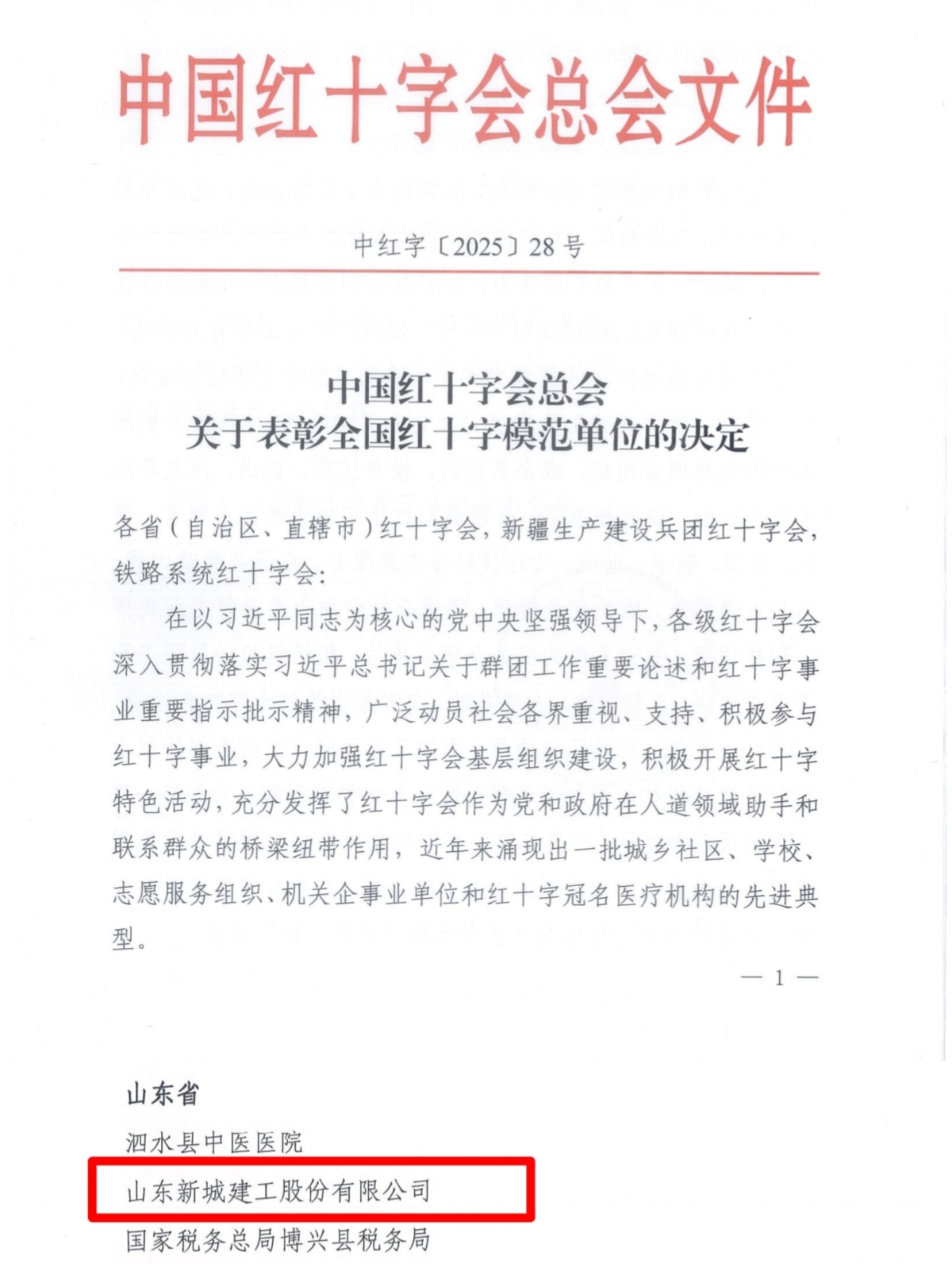 日前,中国红十字会总会发布《关于表彰全国红十字模范单位的决定》,授予一批城乡社区、学校、红十字志愿服务组织、机关事业单位和冠名红十字医疗机构“全国红十字模范单位”称号,山东新城建工股份有限公司凭借在红十字公益服务领域的卓越表现和突出贡献成功入选,为淄博市唯一获此殊荣单位。这一国家级荣誉,是对新城建工长期以来践行红十字精神、积极履行社会责任的最高褒奖。