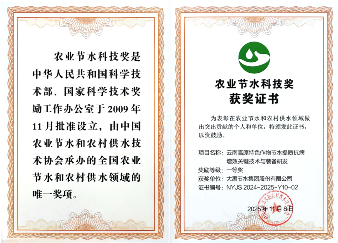 近日,由大禹节水集团联合攻关完成的“云南高原特色作物节水提质抗病增效关键技术与装备研发”项目荣获全国农业节水科技奖一等奖。