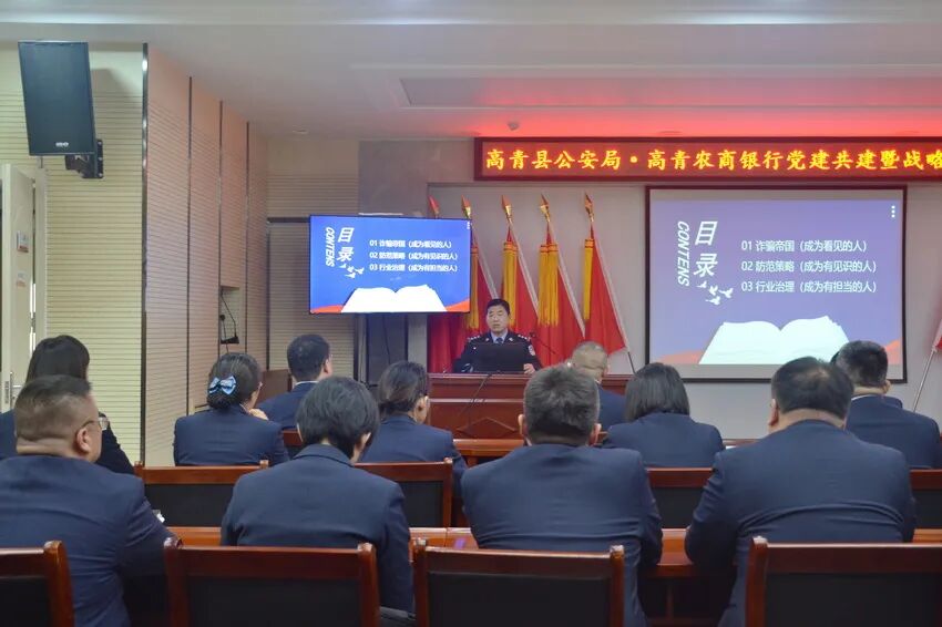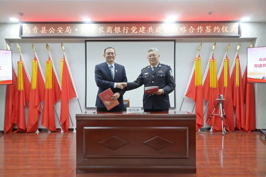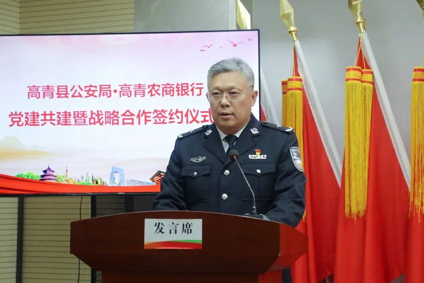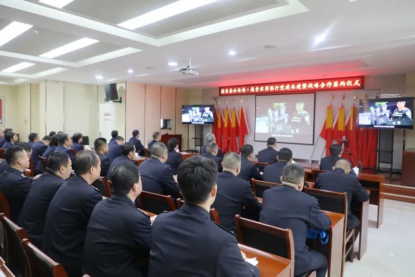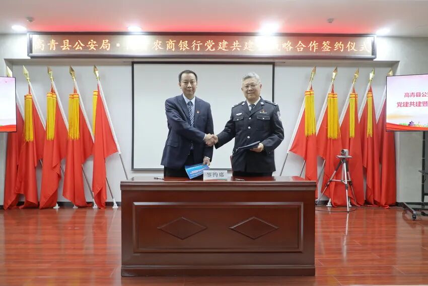 为深入贯彻新时代党的建设总要求,创新基层党建工作模式,推动警银合作向纵深发展,12月3日下午,高青县公安局与高青农商银行举行“党建引领聚合力 警银共建启新程”党建共建暨战略合作签约仪式。县公安局党委副书记、政委吴振华,高青农商银行党委书记、董事长崔现学出席会议并讲话,县公安局、农商银行相关领导班子成员,相关部门、派出所主要负责同志参加活动。