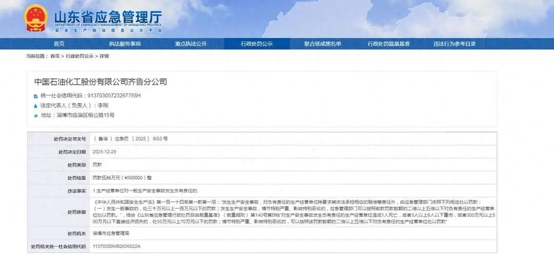 近日,山东省应急管理厅公示了中国石油化工股份有限公司齐鲁分公司的行政处罚决定。