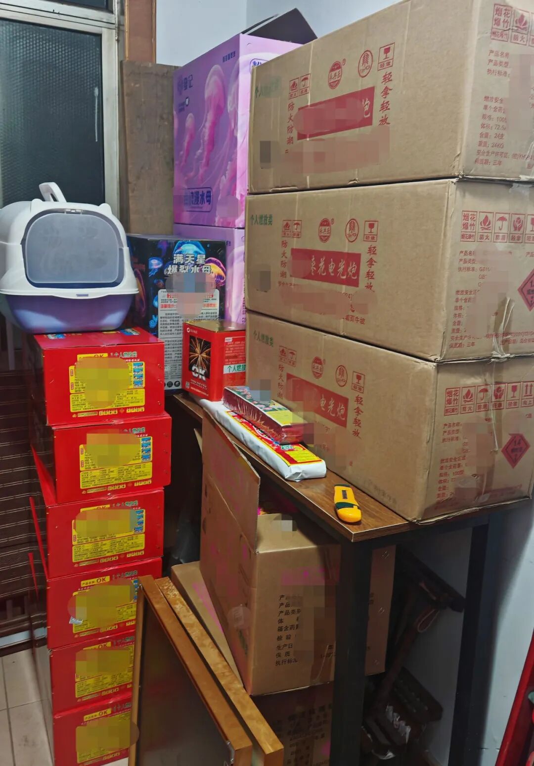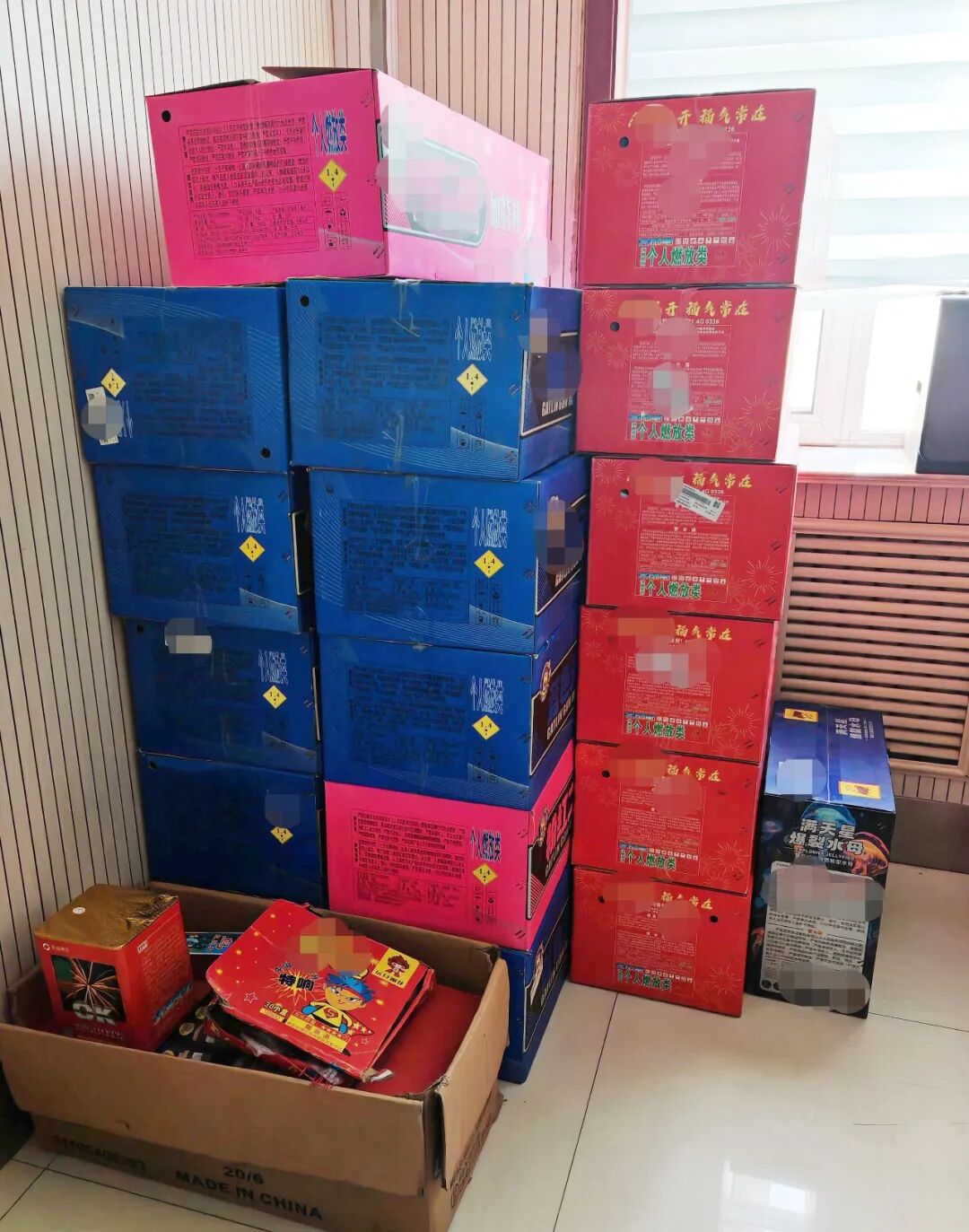 张店分局在日常排查工作中发现,王某某通过网络平台购买了玻璃钢筒、支撑架等专业燃放辅助器材。民警随即展开实地核查,在其家中查获未拆封的烟花爆竹40余箱。