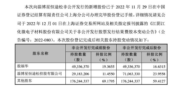 2022年11月29日,淄博星恒以每股15.43元、共计约6.46亿元认购江化微向特定非公开发行的4188.01万股股票,加之前述股份,淄博星恒共持有江化微7106.33万股股票,占总股本的23.9558%,成为控股股东。