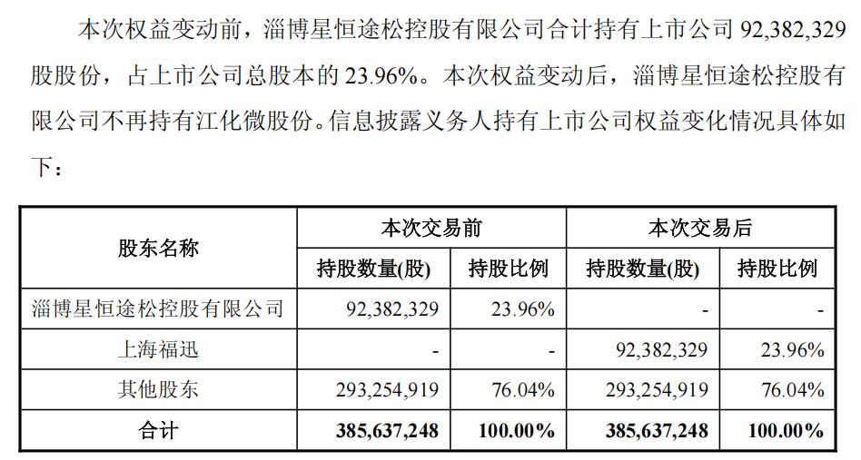 上述交易完成后,淄博星恒将不再持有江化微的股份,江化微控股股东将变为上海福迅,实控人将由淄博市财政局变更为上海市国资委。
