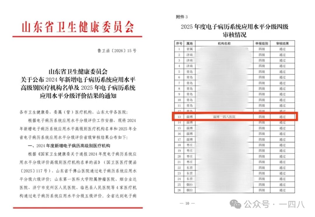 近日,山东省卫健委公布评价结果,淄博一四八医院电子病历系统应用水平顺利通过2025年度分级评价四级审核,标志着该院智慧医疗建设迈上新台阶,获权威认可。