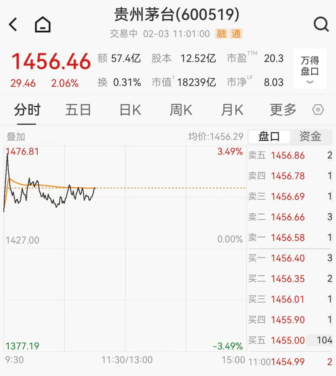 在前一日上涨后,2月3日上午开盘后贵州茅台股价再次上涨,开盘后一度涨超3%,位居白酒板块前列,随后涨幅收窄至2%左右。