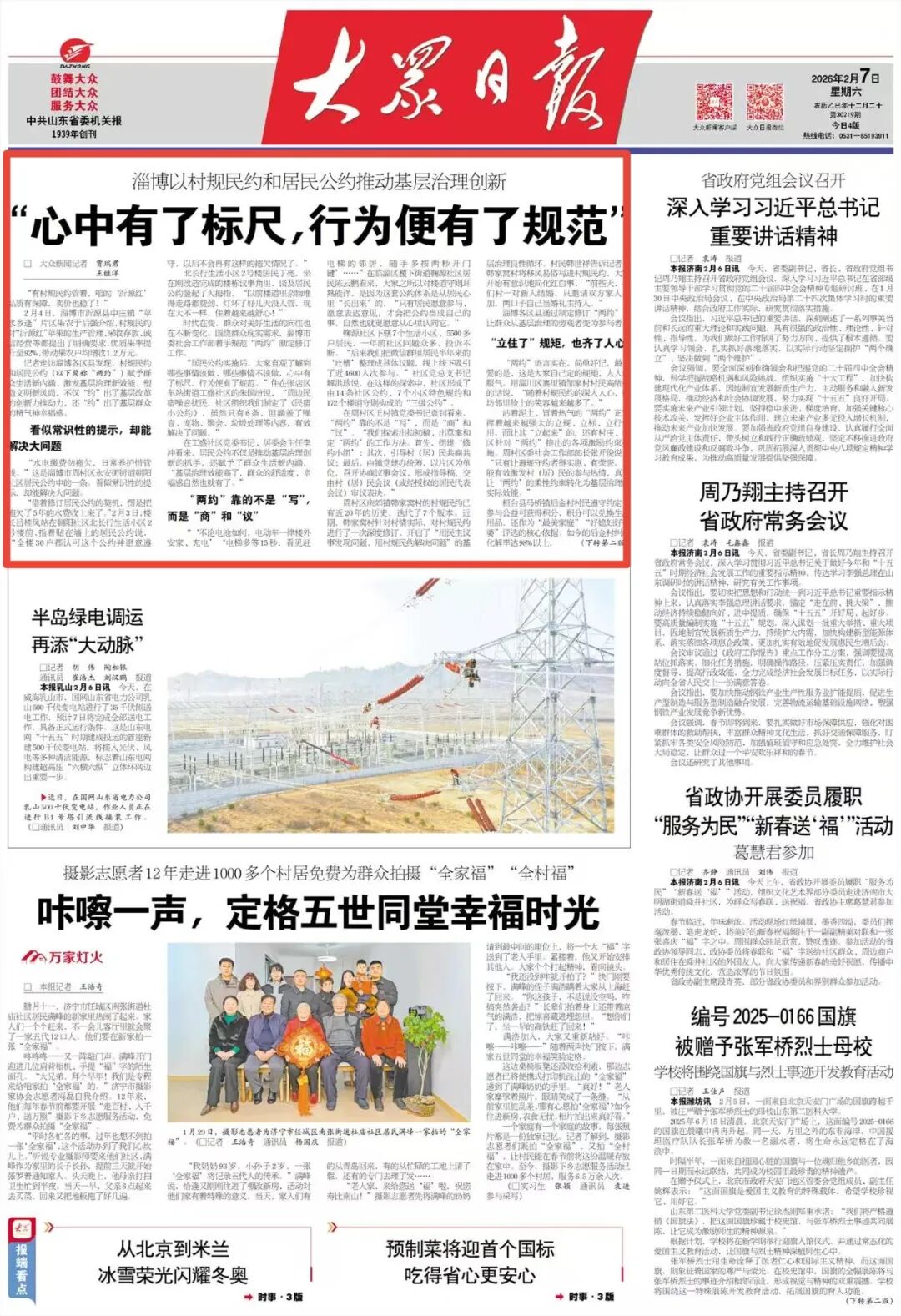 2月7日,《大众日报》头版头条刊发文章《心中有了标尺,行为便有了规范》,点赞淄博市以村规民约和居民公约推动基层治理创新。