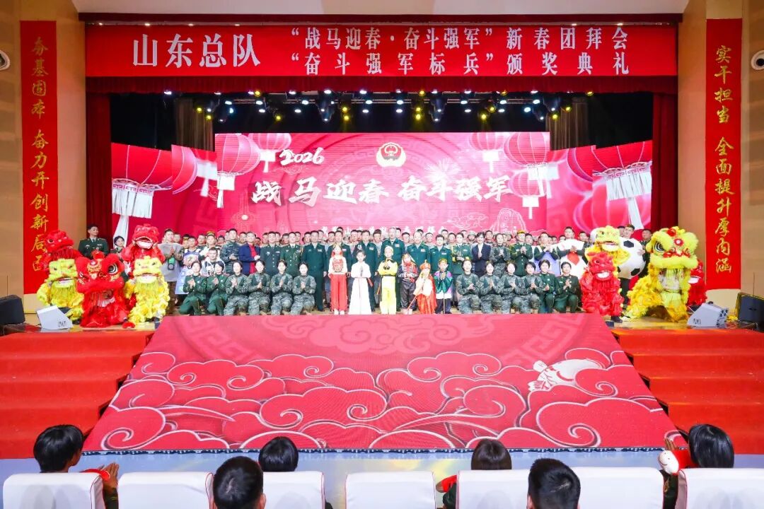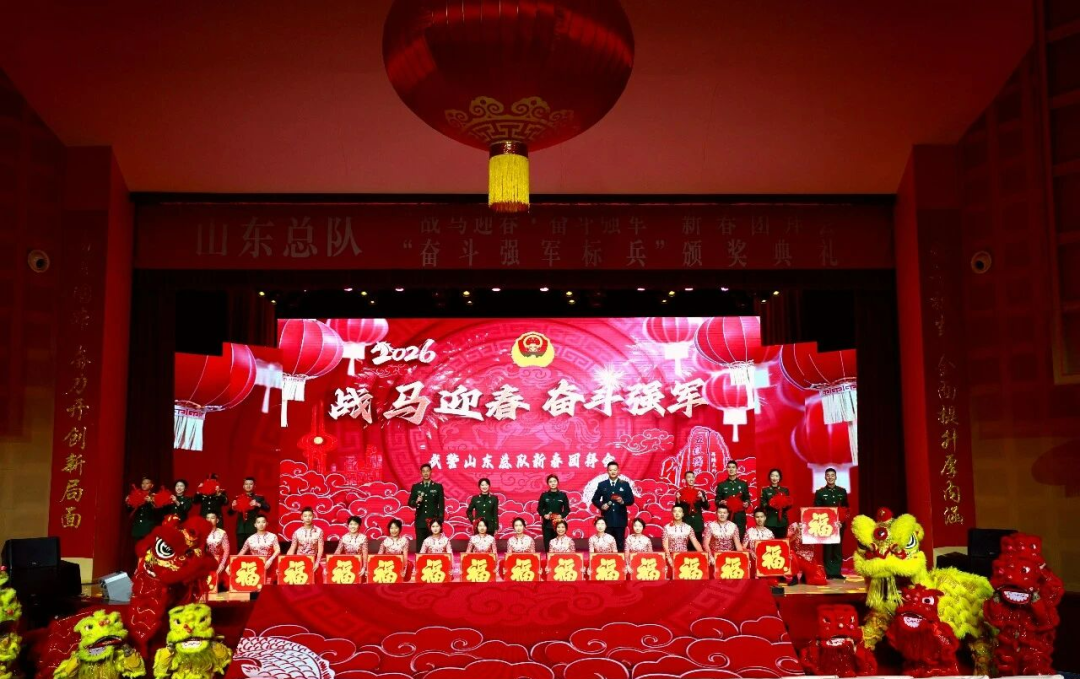 金蛇辞旧岁,战马跃新春。为喜迎丙午马年新春,凝聚强军奋进力量,2月10日下午,武警山东总队隆重举办“战马迎春·奋斗强军”新春团拜会暨“奋斗强军标兵”颁奖典礼。总队在家党委常委、机关干部、直属队官兵及家属欢聚一堂现场观看演出,基层官兵和5万多名网友通过“山东武警”新媒体矩阵网络直播同步收看,共庆新春佳节。