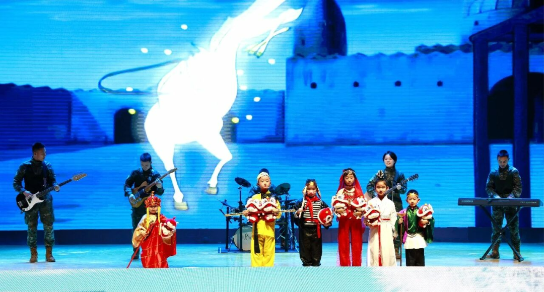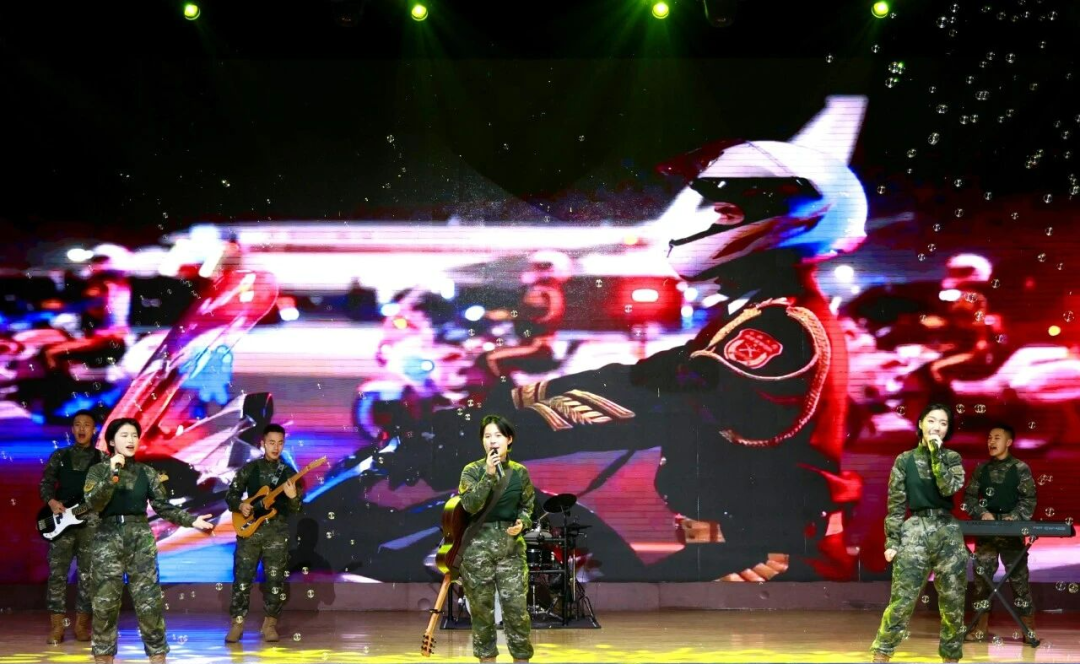 火红的灯笼、高挂的福字、喜庆的中国结,营造出浓浓的节日氛围。“新的时代新的征程,崭新的气象!战旗飞扬战歌嘹亮,青春的力量!”演出在气势磅礴的歌舞表演《春风战歌》中正式拉开帷幕。
