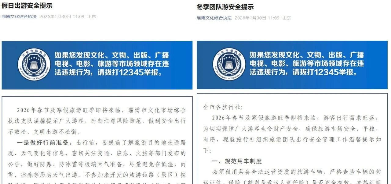 支队以微信公众号为核心宣传阵地,结合寒假出行特点与冬季旅游风险,发布《假日出游安全提示》《冬季团队游安全提示》,从行前准备、出行安全、理性出游、文明游览及维权指引等方面,为游客提供全方位出行指导。各区县同步在微信公众号就春节假期出游事项开展宣传。支队实行行政指导“五步工作法”,对接企业需求,根据春节期间我市营业性演出集中的特点,为演出活动举办单位提供咨询服务10家次,协调指导1家举办单位在我市举办大型营业性演出活动。