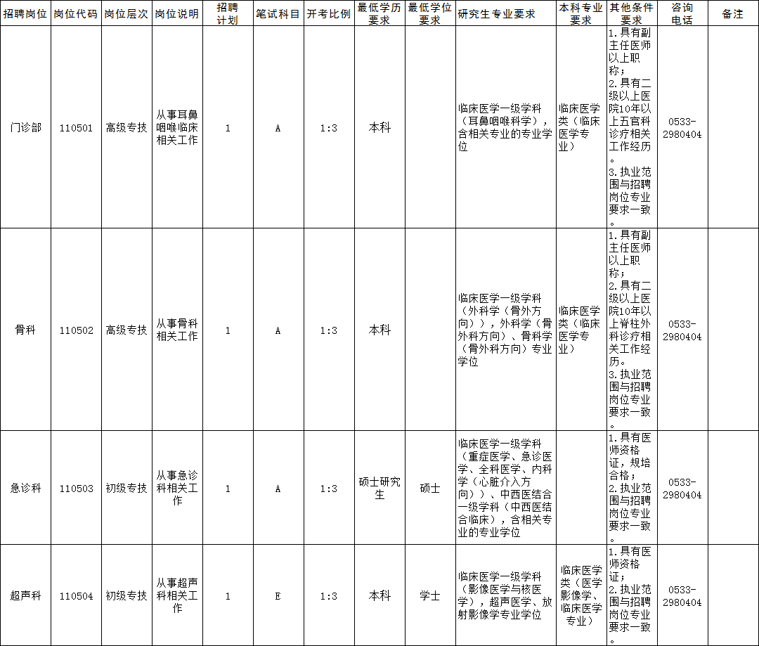 岗位咨询电话:淄博市第四人民医院人事科 0533-2980404