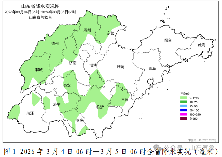 3月4日06时至5日06时,全省共有12市、45县(市、区)出现降水,平均降水量0.2(毫米,下同),折合水量约0.3亿方。各市平均:聊城1.2、德州0.9、济南0.2、滨州0.2、东营0.1、泰安0.1、临沂0.1、枣庄0.1、济宁0.1和日照0.1,其他市降水量不足0.1或无降水。县(市、区)平均降水量超过1.0的10个,前3位的是:聊城茌平2.2、聊城市区1.9和聊城东阿1.7。今年以来全省平均降水量33.4,较常年同期偏多10.6(46%)。