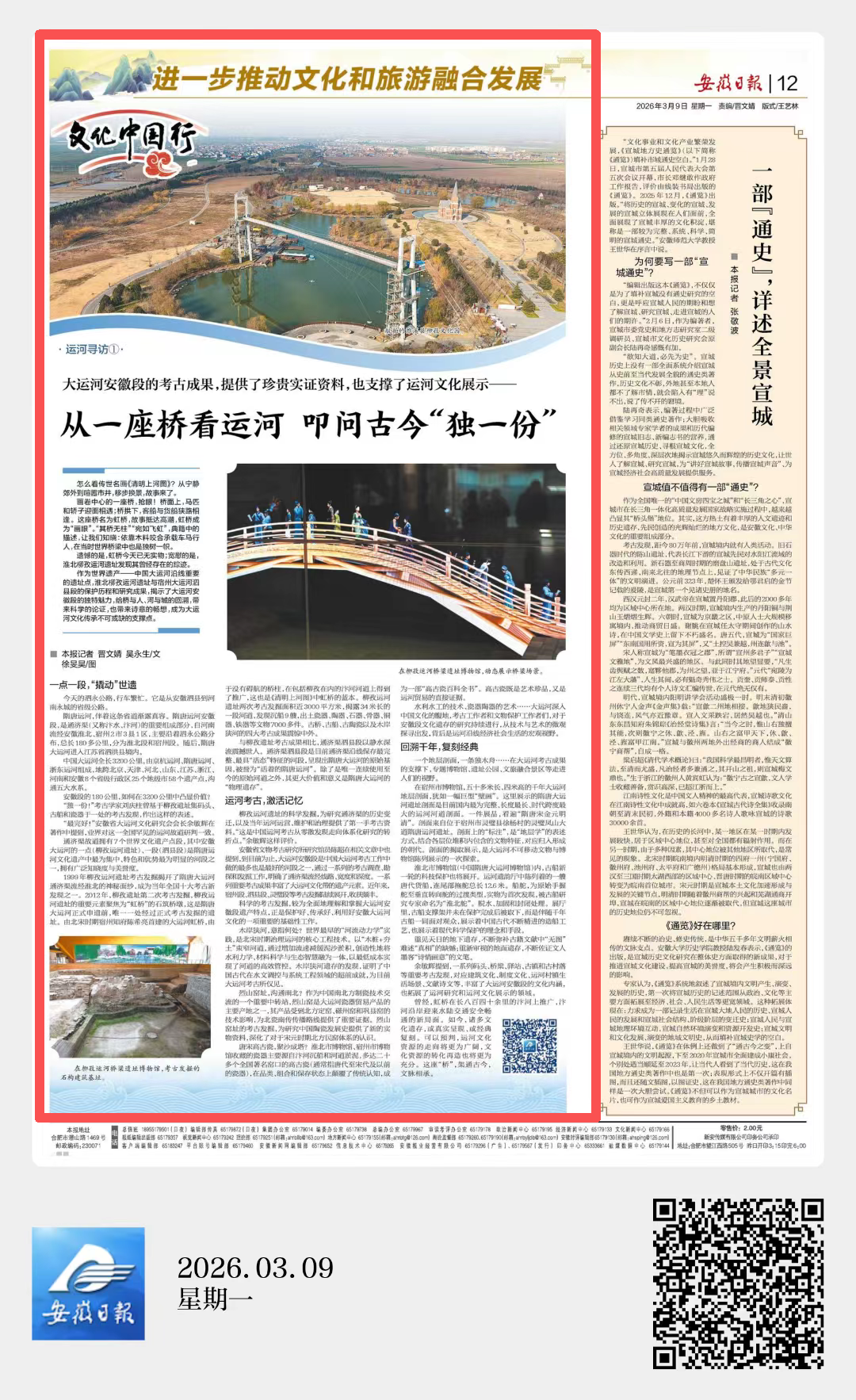 刊发文章《大运河安徽段的考古成果,提供了珍贵实证资料,也支撑了运河文化展示——从一座桥看运河 叩问古今“独一份”》