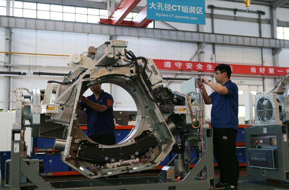 在山东新华医疗器械股份有限公司,工作人员在车间组装医疗设备。