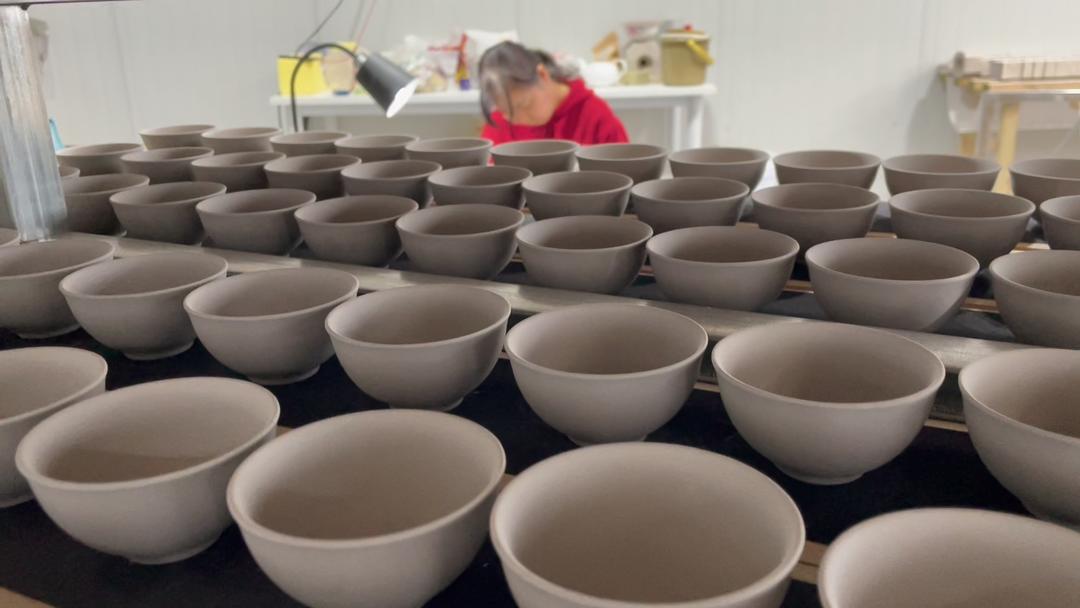 车间工人忙着将一个个茶具的素坯修整好、排列齐,等待下一炉素烧。