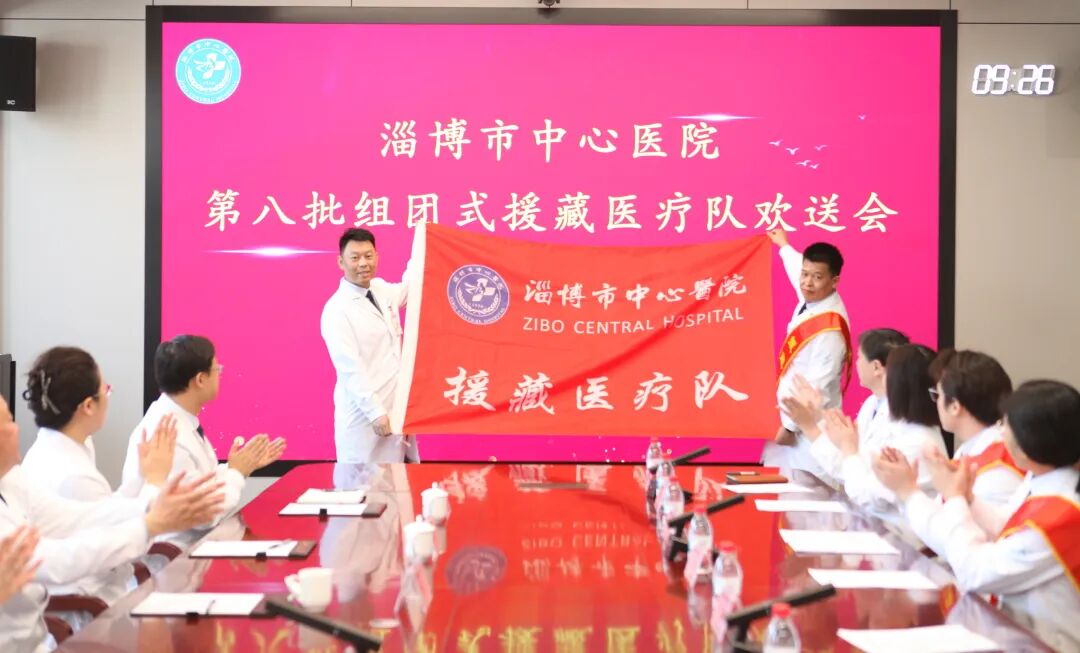 欢送会邀请第七批援藏医疗队队长董盟介绍援藏工作内容及注意事项,并将象征使命与责任的“淄博市中心医院援藏医疗队”队旗郑重交接给第八批援藏医疗队队长王现彬。